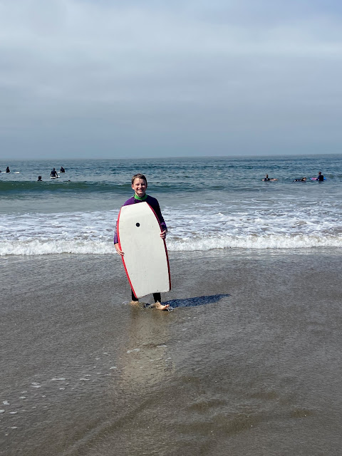 We went to Manresa Beach with some friends on the 4th of July. We left early n the morning with plans to leave around 3:00 to be home in time for showers and fireworks. I assumed we would have a chilly, overcast morning, but I'm so glad I was wrong. It couldn't have been more perfect. The clouds burned off within the first hour and we enjoyed a gorgeous, sunny day. The kids played their hearts out. Jack only left the water once, for a quick lunch break. We didn't do a good enough job of reapplying his sunscreen and he ended up with a vicious sunburn on his face and hands - but thankfully nowhere else, since he had a wetsuit on the whole time. Gemma was in and out, varying her activities between bodyboarding, sand digging, and sunbathing. Hazel was similar, although she spent more time in the waves than Gemma did.